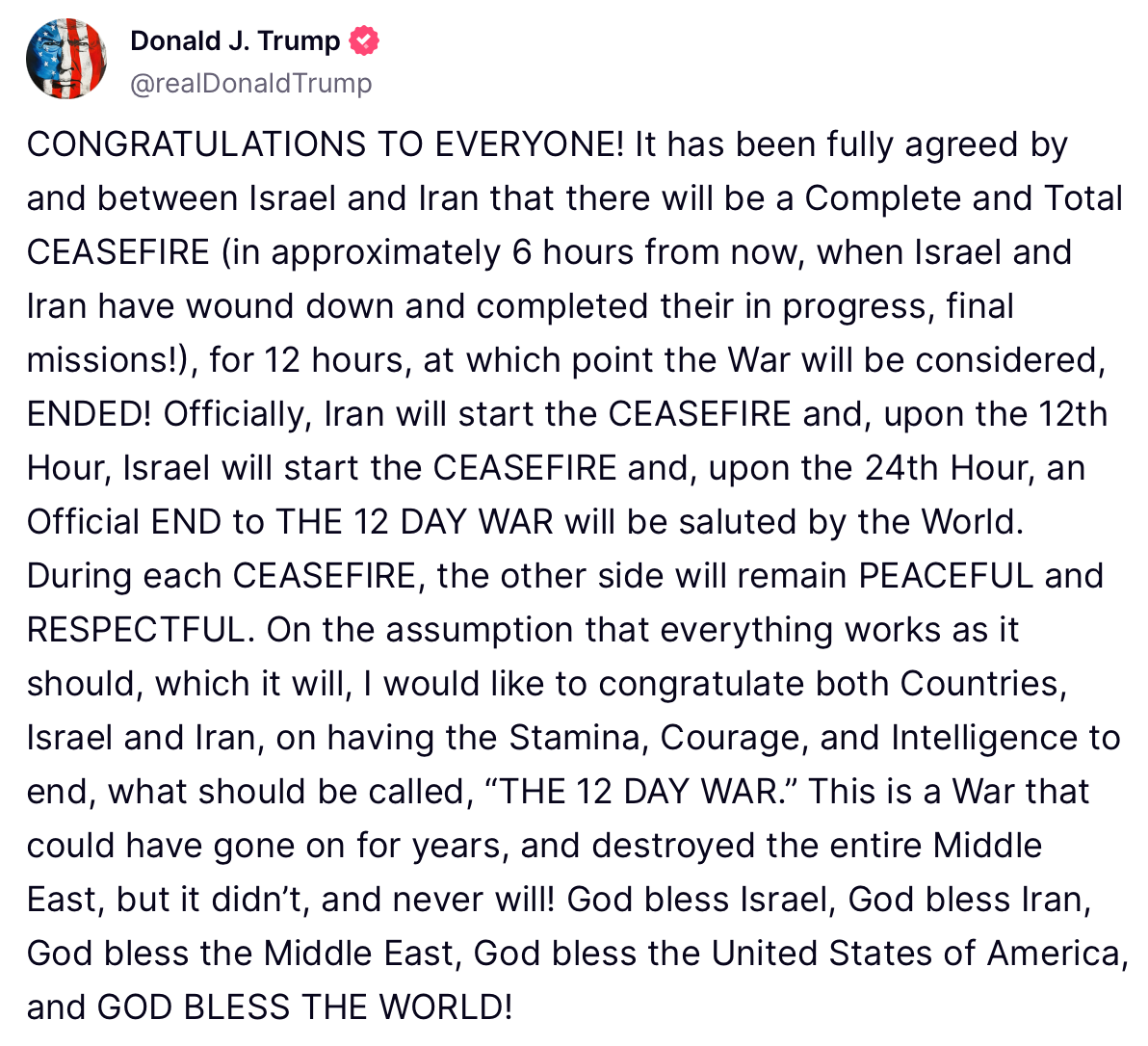 Israel agreed, but as always within hours it had violated the cease fire with its heaviest attack to date on Tehran. Trump in a statement June 24 criticized both sides but especially Israel, saying ““Israel, as soon as we made the deal they came out and they dropped a load of bombs, the likes of which I’ve never seen before. The biggest load that we’ve seen…I’m not happy with Israel. You know, when I say, ‘OK now you have 12 hours,’ you don’t go out to the first hour, just drop everything you have on, so I’m not happy with them. I’m not happy with Iran either.” Trump continued his censure in a Truth Social post that appeared shortly after, all caps are his.