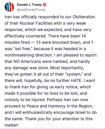 What then of the US attack? This was widely telegraphed. In the days before the attack X posted maps of the eastward flight of most of the US Air Force refuleing airplanes. Widely reported was that Trump would make a decision to attack Iran within 2 weeks. It took him only 2 days to launch the attack.